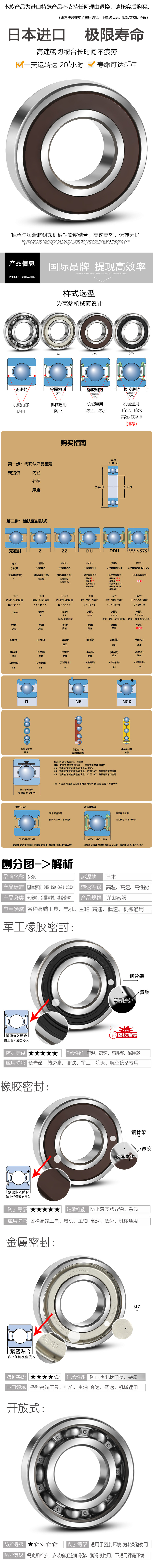 特性 深溝球軸承是應用最普遍的軸承類型,廣泛應用于在不同的領域。 深溝球軸承包括帶防塵蓋及密封圈、內部填充潤滑脂的密封軸承,應用方便。 另外還包括,用于安裝定位的外圈帶止動環(huán)軸承、吸收軸承座溫升引起的軸承配合面尺寸變化的膨脹補償軸承、 以及耐油污垢強的TAB型軸承等各種各樣的軸承。