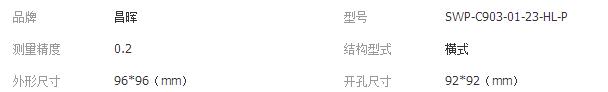 二、SWP-C903-01-23-HL-P具體參數(shù):外形尺寸:96*96mm 開孔尺寸:92*92mm 不帶通訊 繼電器輸出,可切換輸入,帶上下限報(bào)警、24v饋電輸出。