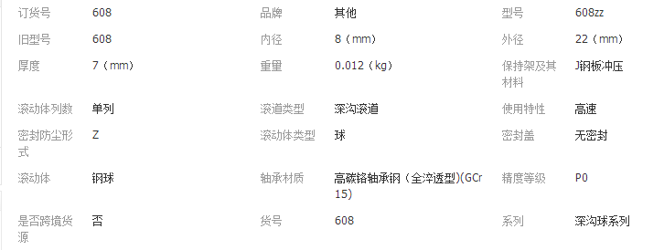 >產(chǎn)品供應(yīng)>家電行業(yè)>軸承>608不銹鋼混合陶瓷軸承尺寸8*22*7mm超長(zhǎng)空轉(zhuǎn) 承陀螺軸批發(fā) 電子配件 、電子元器件、軸承及相關(guān)配套產(chǎn)品、數(shù)碼產(chǎn)品及周邊產(chǎn)品技術(shù)開發(fā)與銷售;國(guó)內(nèi)貿(mào)易;經(jīng)營(yíng)電子商務(wù);貨物及技術(shù)進(jìn)出口…