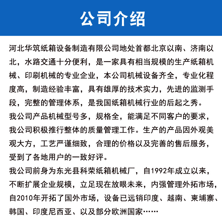 我公司前身為東光縣科榮紙箱機(jī)械廠,自1992年成立以來,不斷擴(kuò)展企業(yè)規(guī)模,立足現(xiàn)在放眼未來,內(nèi)強(qiáng)管理外拓市場,自2010年開拓了國外市場,設(shè)備已遠(yuǎn)銷印度、越南、柬埔寨、韓國、印度尼西亞、以及部分歐洲國家,我公司2018年新注冊公司名為河北華筑紙箱設(shè)備制造有限公司,進(jìn)一步擴(kuò)大了企業(yè)規(guī)模,同時也加大了科研力度,研制出多種新產(chǎn)品類型,獲得“河北省科技型企業(yè)”等10多項(xiàng)企業(yè)榮譽(yù),力求以物美價廉的產(chǎn)品和完備周到的售后服務(wù)真正做到讓客戶買的放心,用的舒心,實(shí)現(xiàn)雙贏多贏,董事長李樹軍歡迎社會各界人事蒞臨指導(dǎo),共創(chuàng)實(shí)體經(jīng)濟(jì)發(fā)展新臺階