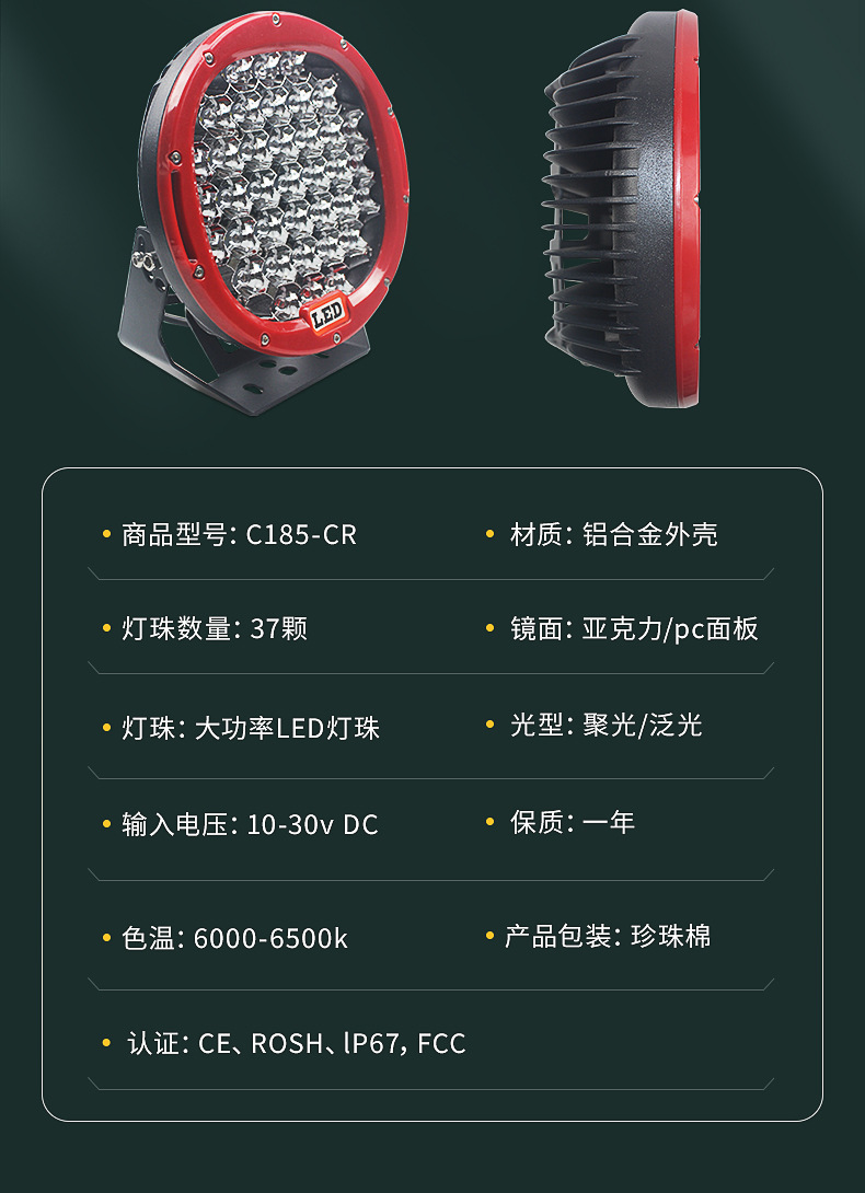 >產(chǎn)品供應(yīng)> HVAC汽車(chē)>車(chē)身件>汽車(chē)燈具>現(xiàn)貨9英寸LED工作燈185W改裝越野車(chē)燈汽車(chē)LED圓形射燈 LED駕駛燈 店家推薦 人氣單品 新品上架 LED駕駛燈 LED工作燈 LED霧燈 LED貨車(chē)燈 LED長(zhǎng)條燈