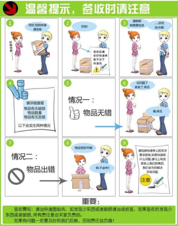 ②在您收到物品快遞時(shí)一定要拆開包裝確保無損壞后再簽收,如若發(fā)現(xiàn)問題請于24小時(shí)內(nèi)與我們電話聯(lián)系。