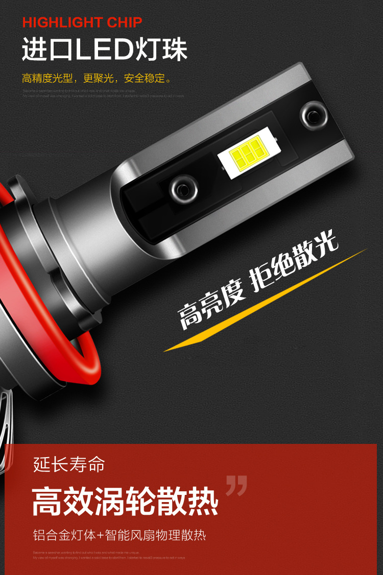 4.壽命長:采用鋁合金燈體+10000轉(zhuǎn)高速靜音風扇雙重物理散熱,有效降低燈體溫度,延長大燈使用壽命。