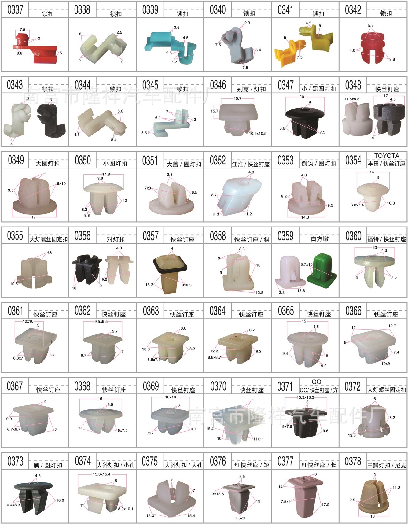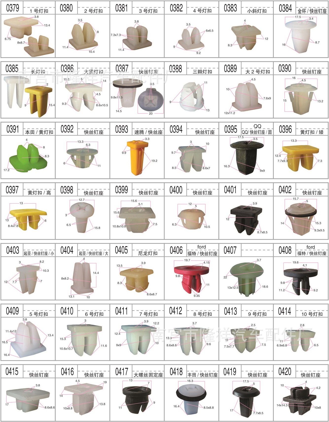 門板卡扣系列 頂蓬卡扣系列 膨脹螺絲系列 封皮卡扣系列 穿芯釘系列 密封條釘系列 線/管束固定夾 隔熱棉卡扣 玻璃托卡扣 支撐…