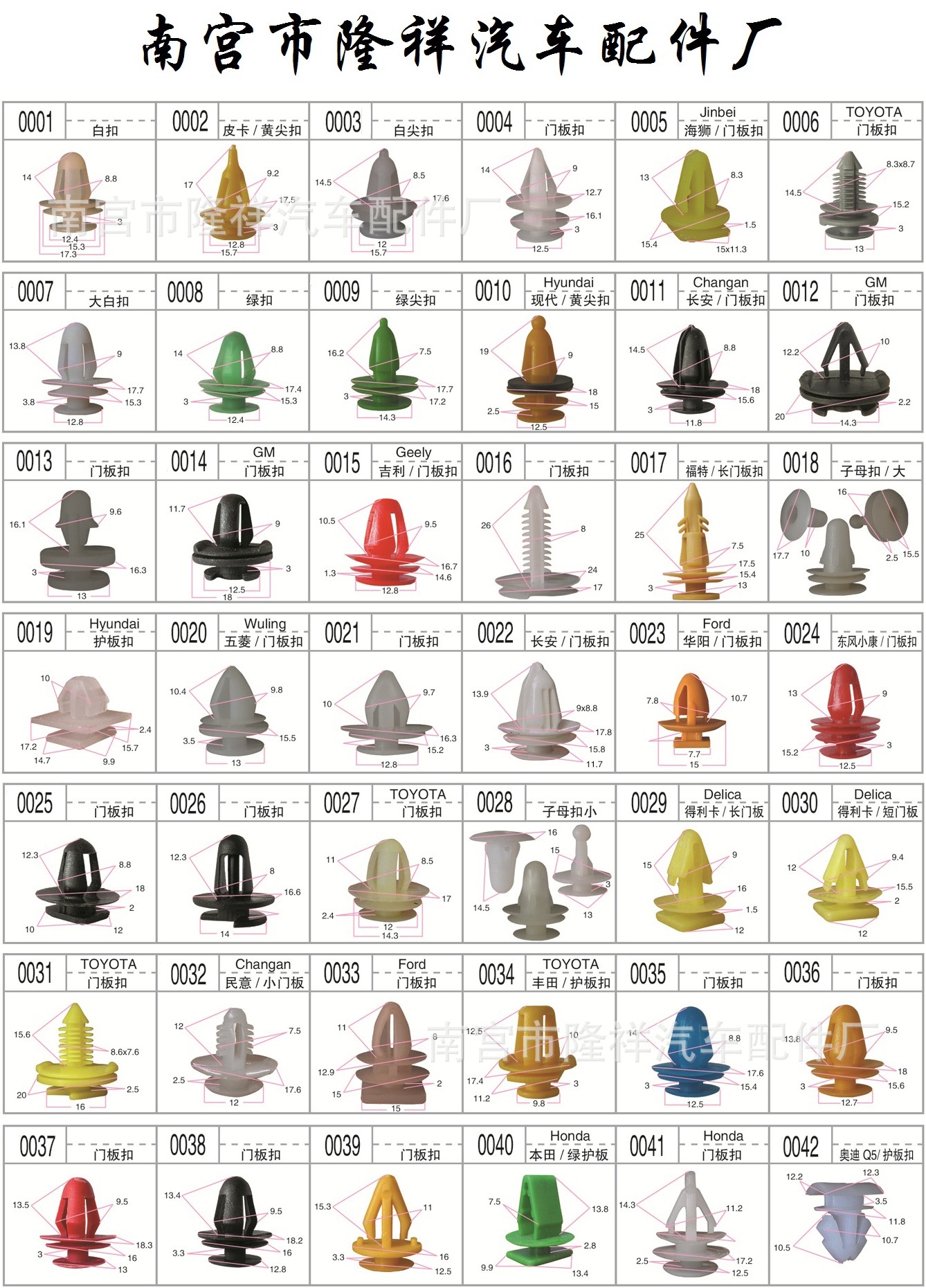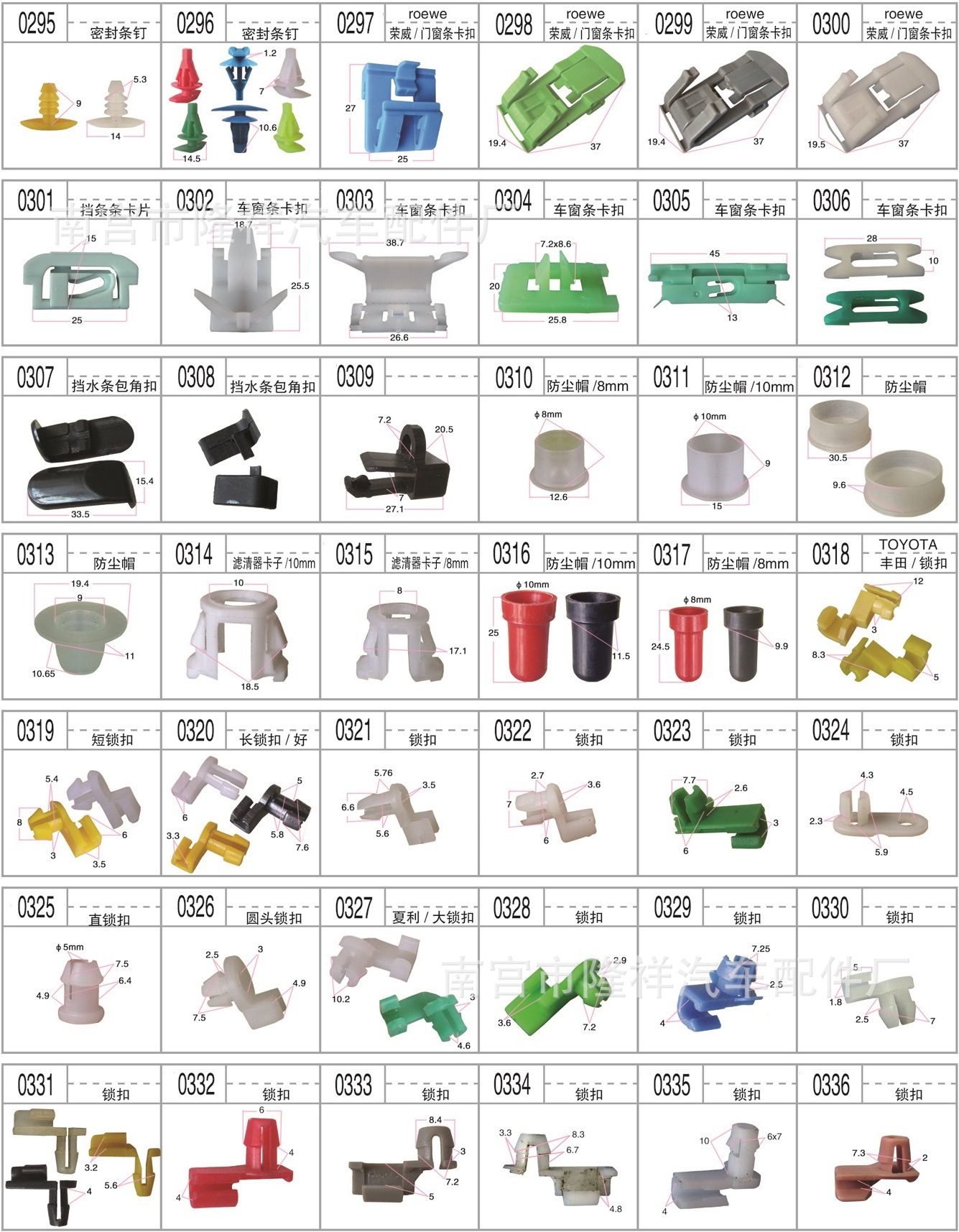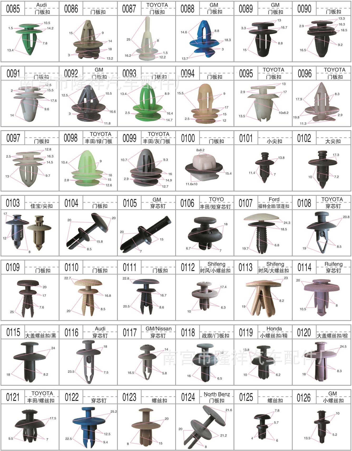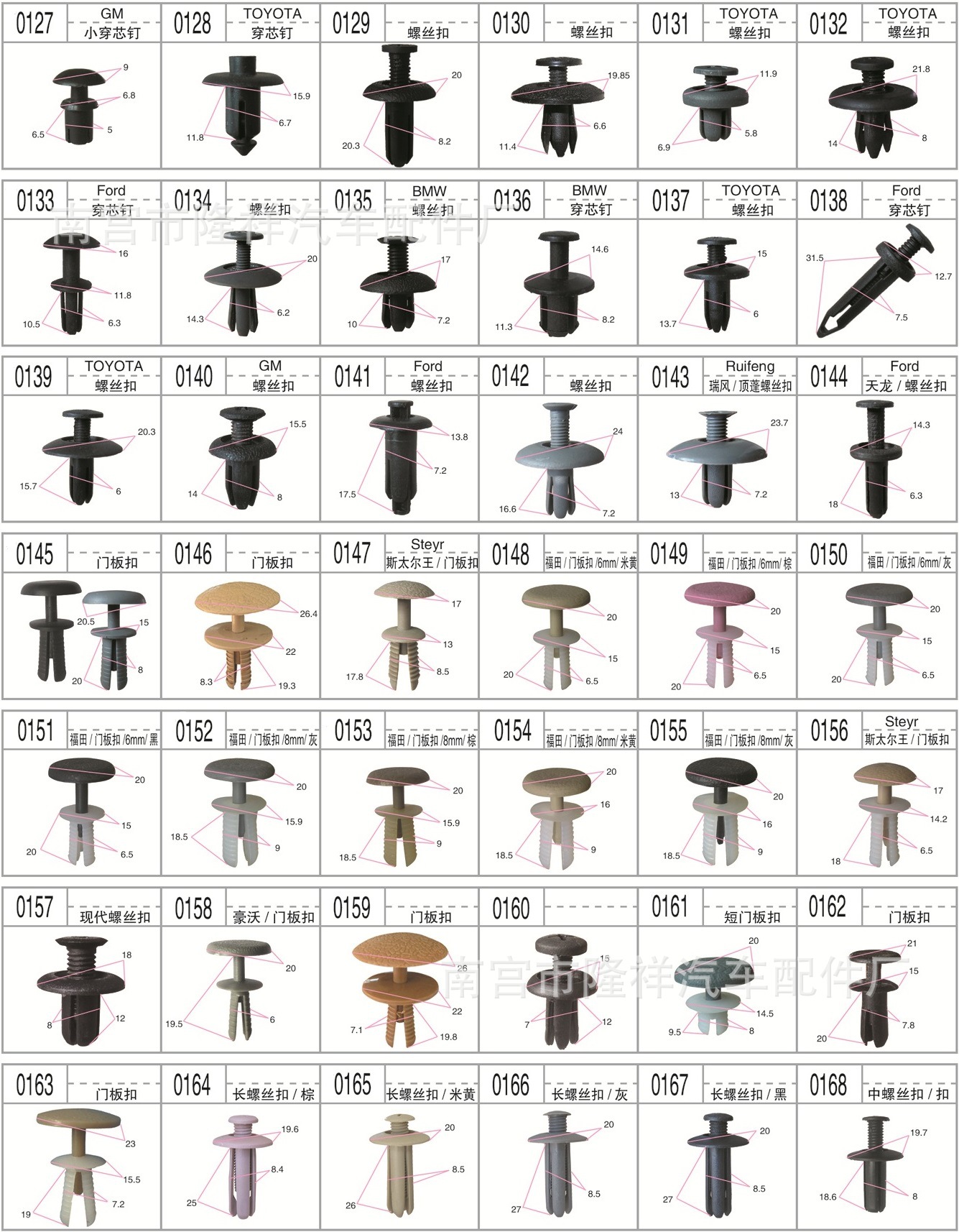 門板卡扣系列 頂蓬卡扣系列 膨脹螺絲系列 封皮卡扣系列 穿芯釘系列 密封條釘系列 線/管束固定夾 隔熱棉卡扣 玻璃托卡扣 支撐…