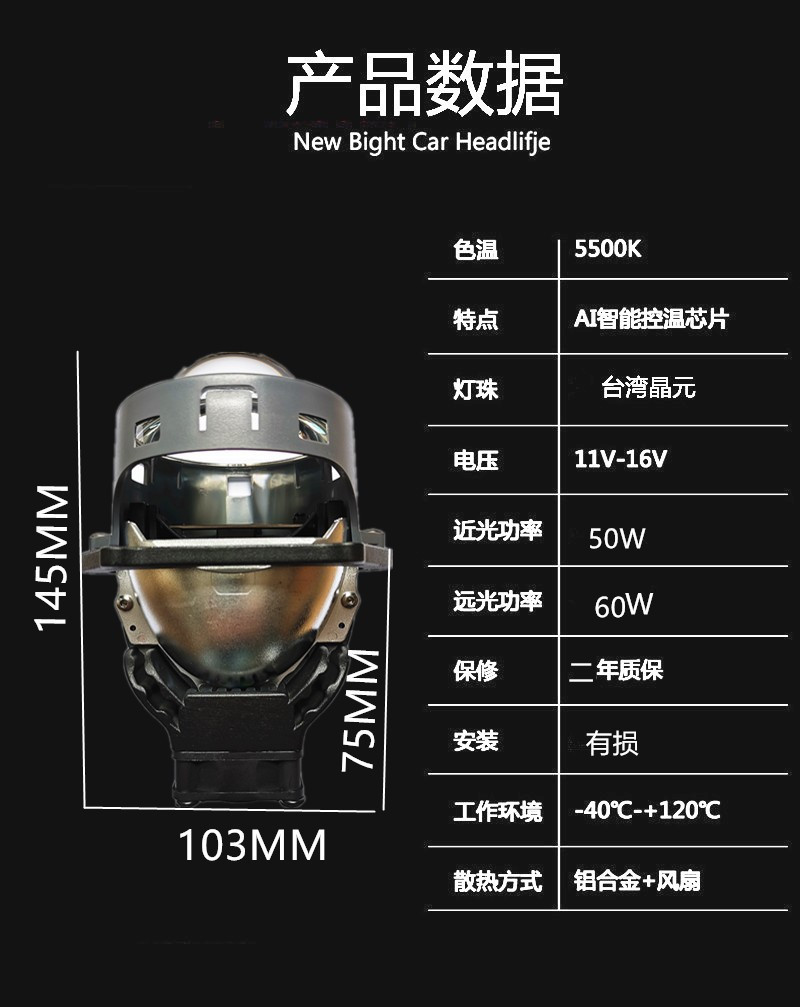 本款是新一代LED雙光透鏡,采用臺灣車規(guī)燈珠 ,雙燈杯,鋪路效果更好!降溫系統(tǒng)用 CPU級高轉(zhuǎn)速滾珠風(fēng)扇,散熱快 使燈珠使用壽命更長!展示的產(chǎn)品是中性產(chǎn)品,如果需要我司品牌,下單時請備 注。采購10對起 可雕刻您的商標.