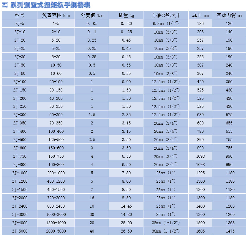 ZJ 扭力扳手規(guī)格表