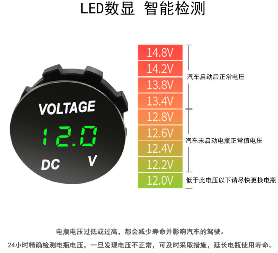 1.12VDC 磨砂款帶LED燈三位數(shù)顯電壓表CE 認(rèn)證,船舶汽車摩托車用,帶環(huán)狀