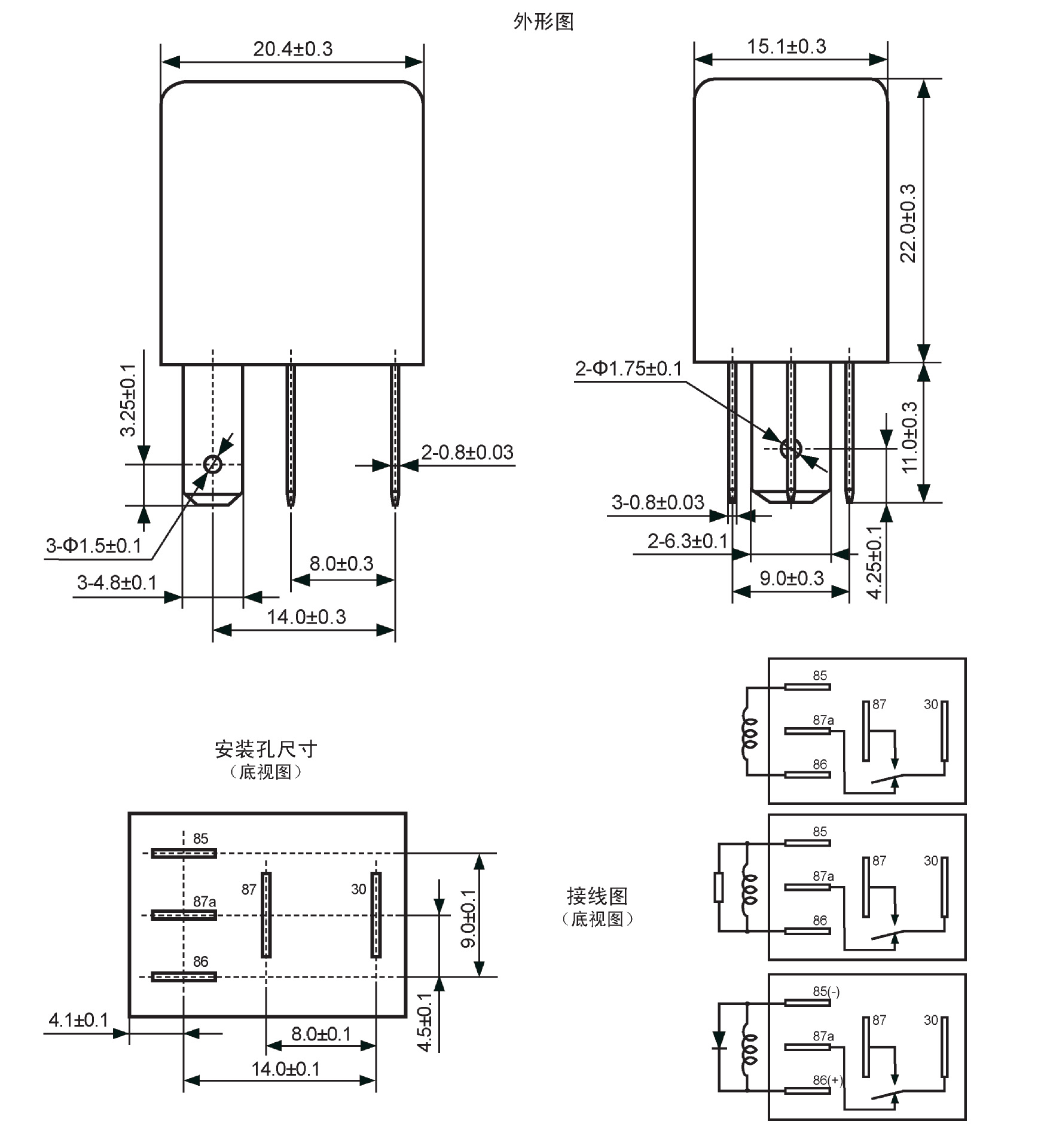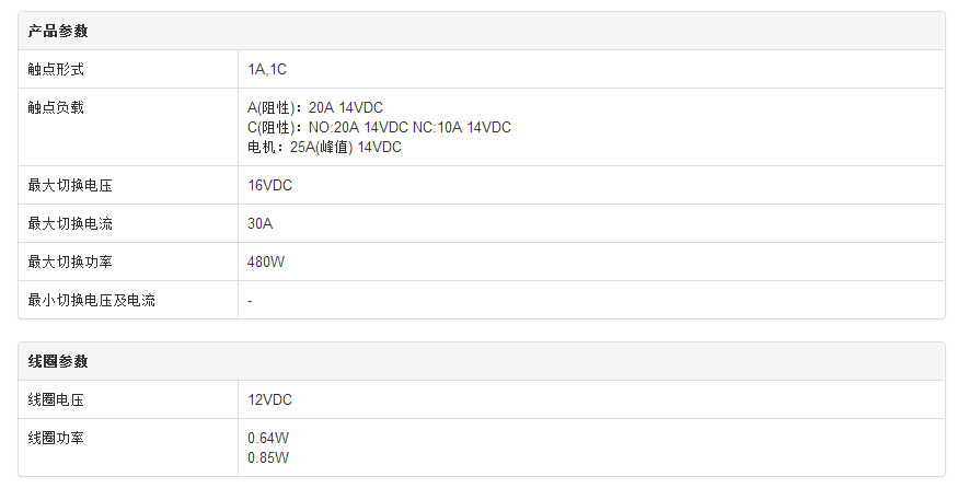 觸點負載NO/NC:20A/10A 14VDC