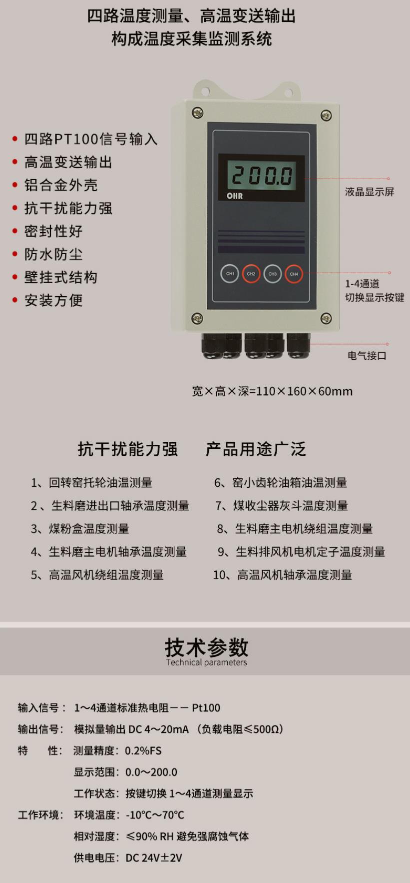 壁掛式數(shù)字顯示控制儀,OHR-XTRT系列溫度遠(yuǎn)傳監(jiān)測(cè)儀采用了表面貼裝工藝,全自動(dòng)貼片機(jī)生產(chǎn),具有很強(qiáng)的抗干擾能力。本儀表支持兩路PT100輸入,實(shí)現(xiàn)對(duì)溫度物理的測(cè)量顯示,帶RS485通訊輸出功能,帶雙屏數(shù)碼管顯示,上窗口顯示第1路測(cè)量值,下窗口顯示第2路測(cè)量值。