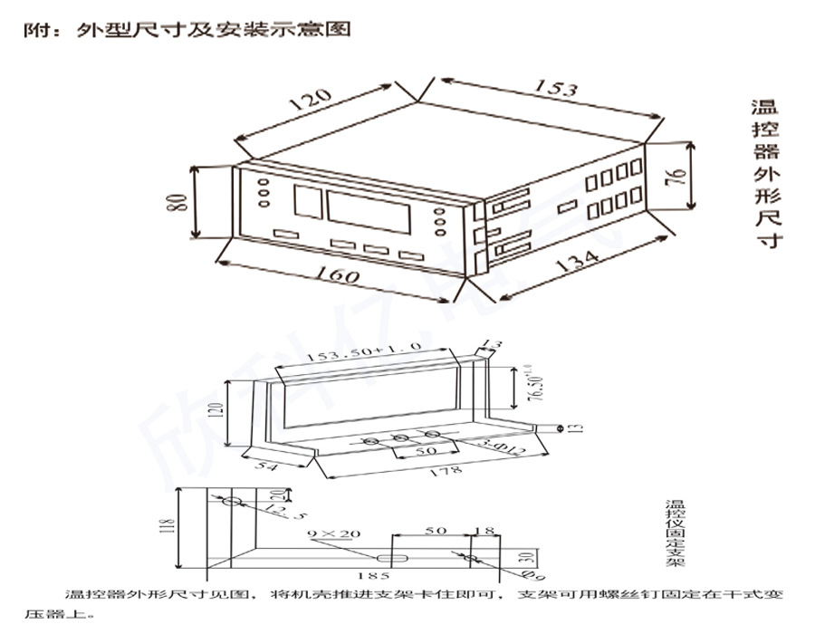 11.設(shè)備外型尺寸80mm×160mm×120mm,嵌裝開孔尺寸:154mm×77mm