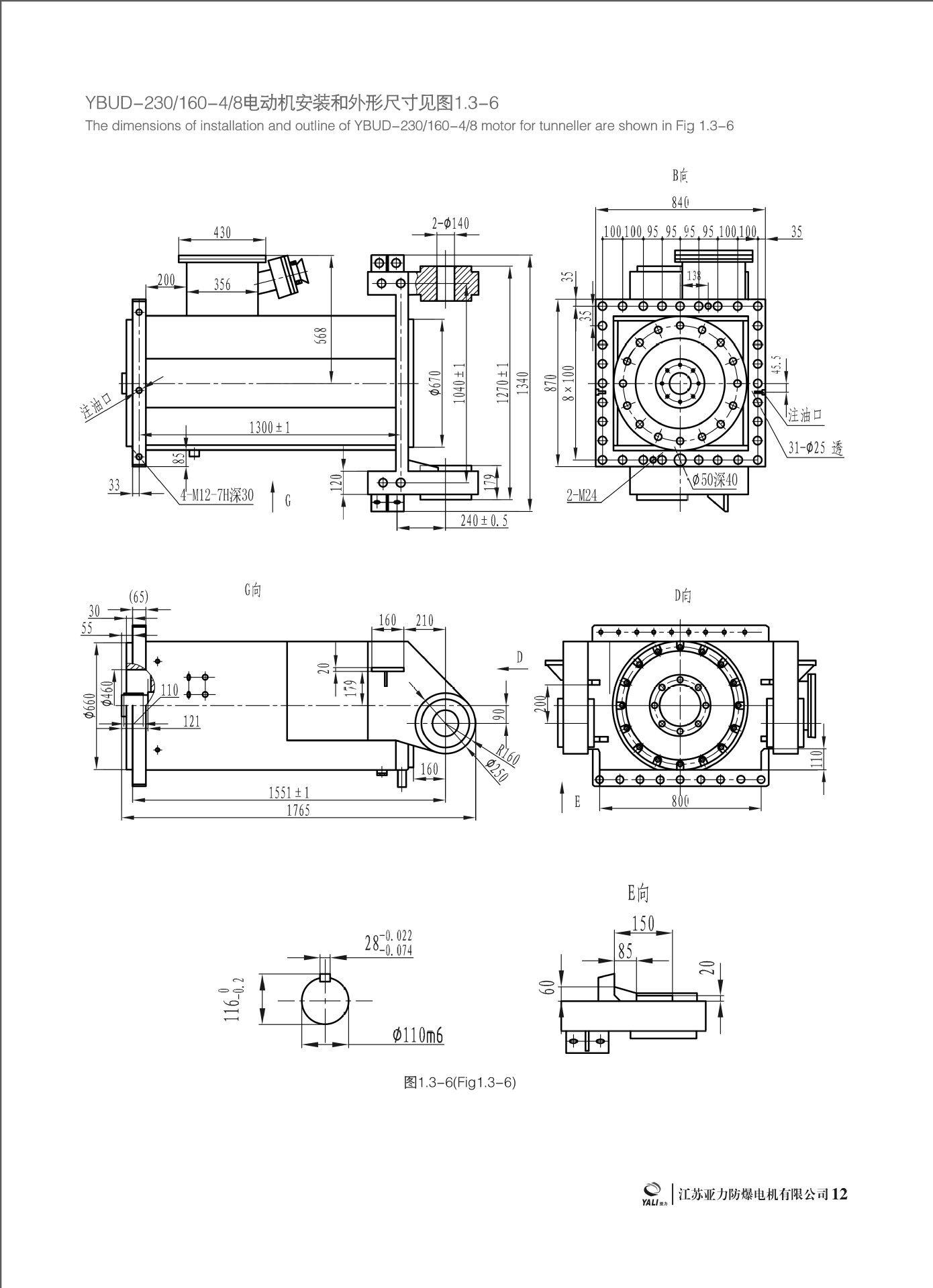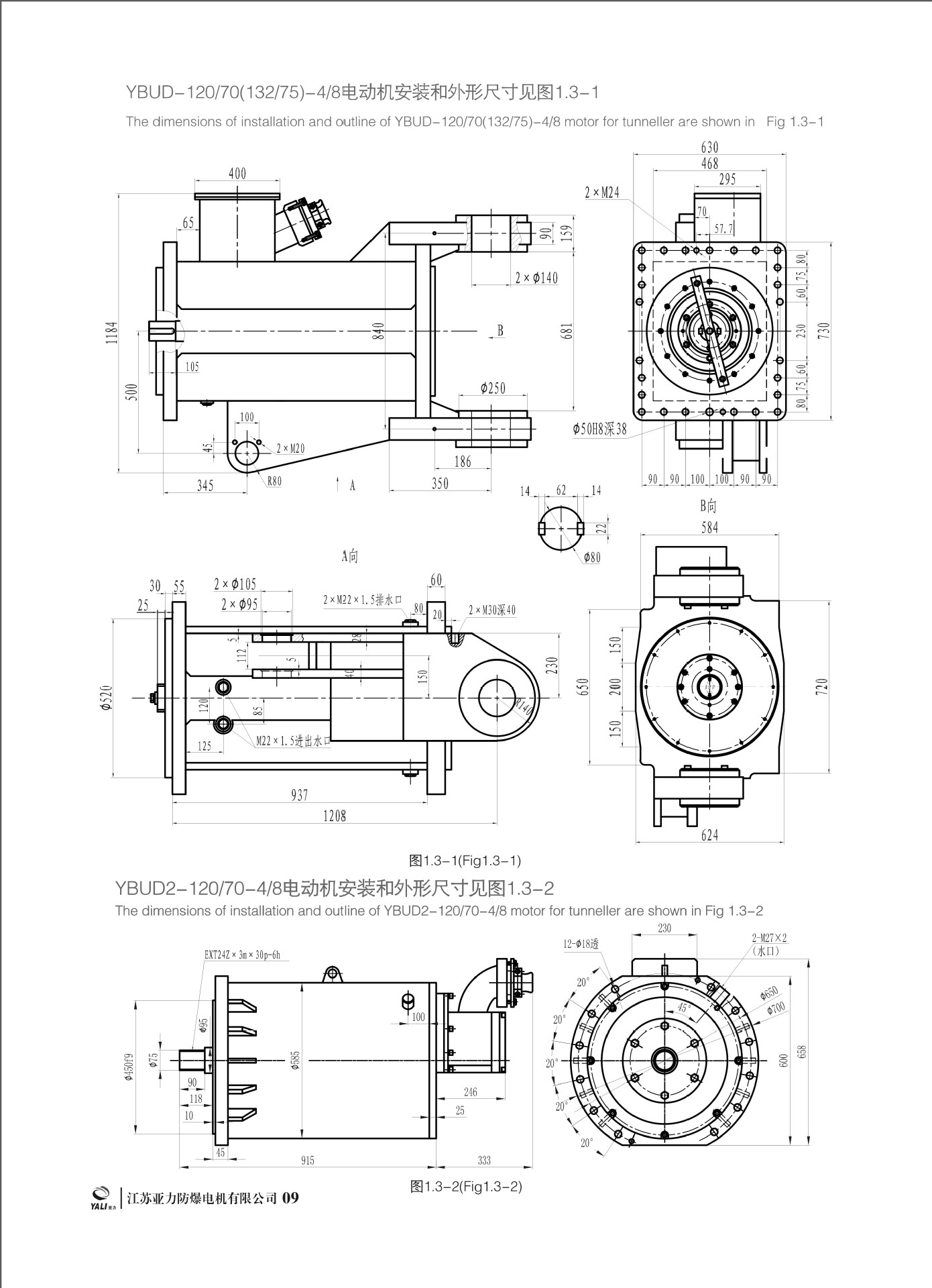 | The dimensions of installation and outline of YBUD-320/220-4/8 motor for tunneller are shown in Fig 1.3-12 |