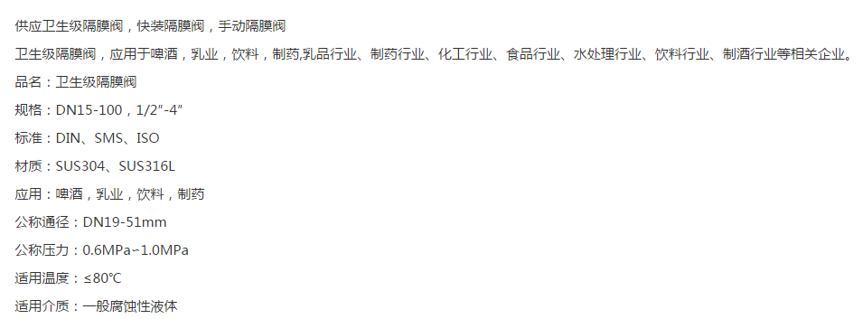 本網(wǎng)頁所展示的有關【供應衛(wèi)生級隔膜閥 衛(wèi)生級快裝隔膜閥 不銹鋼手動隔膜閥 溫州產(chǎn)隔膜閥_閥門_溫州經(jīng)濟技術開發(fā)區(qū)沙城一川閥門管件加工廠】的信息/圖片/參數(shù)等由全球零部件網(wǎng)的會員【溫州經(jīng)濟技術開發(fā)區(qū)沙城一川閥門管件加工廠】提供,由全球零部件網(wǎng)會員【溫州經(jīng)濟技術開發(fā)區(qū)沙城一川閥門管件加工廠】自行對信息/圖片/參數(shù)等的真實性、準確性和合法性負責,本平臺(本網(wǎng)站)僅提供展示服務,請謹慎交易,因交易而產(chǎn)生的法律關系及法律糾紛由您自行協(xié)商解決,本平臺(本網(wǎng)站)對此不承擔任何責任。您在本網(wǎng)頁可以瀏覽【供應衛(wèi)生級隔膜閥 衛(wèi)生級快裝隔膜閥 不銹鋼手動隔膜閥 溫州產(chǎn)隔膜閥_閥門_溫州經(jīng)濟技術開發(fā)區(qū)沙城一川閥門管件加工廠】有關的信息/圖片/價格等及提供【供應衛(wèi)生級隔膜閥 衛(wèi)生級快裝隔膜閥 不銹鋼手動隔膜閥 溫州產(chǎn)隔膜閥_閥門_溫州經(jīng)濟技術開發(fā)區(qū)沙城一川閥門管件加工廠】的商家公司簡介、聯(lián)系方式等信息。