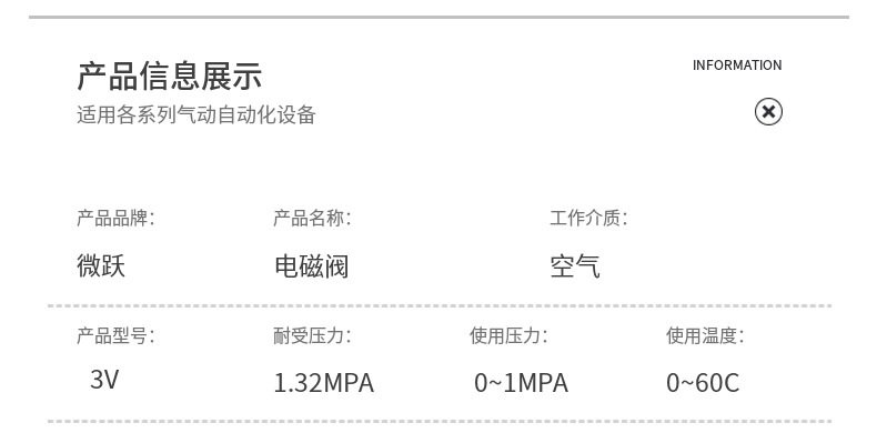 本網(wǎng)頁所展示的有關(guān)【氣動電磁閥二位三通3V210-08-NC氣缸控制110一進(jìn)一出310 410換向_電磁閥_廣州微躍氣動科技有限公司】的信息/圖片/參數(shù)等由全球零部件網(wǎng)的會員【廣州微躍氣動科技有限公司】提供,由全球零部件網(wǎng)會員【廣州微躍氣動科技有限公司】自行對信息/圖片/參數(shù)等的真實(shí)性、準(zhǔn)確性和合法性負(fù)責(zé),本平臺(本網(wǎng)站)僅提供展示服務(wù),請謹(jǐn)慎交易,因交易而產(chǎn)生的法律關(guān)系及法律糾紛由您自行協(xié)商解決,本平臺(本網(wǎng)站)對此不承擔(dān)任何責(zé)任。您在本網(wǎng)頁可以瀏覽【氣動電磁閥二位三通3V210-08-NC氣缸控制110一進(jìn)一出310 410換向_電磁閥_廣州微躍氣動科技有限公司】有關(guān)的信息/圖片/價(jià)格等及提供【氣動電磁閥二位三通3V210-08-NC氣缸控制110一進(jìn)一出310 410換向_電磁閥_廣州微躍氣動科技有限公司】的商家公司簡介、聯(lián)系方式等信息。