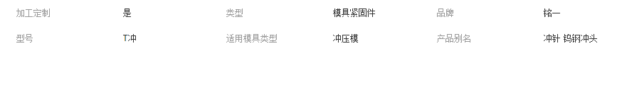 H型直身沖頭、A型二級沖頭、刃口成型沖頭、K型抽芽沖頭、B型引導(dǎo)沖頭、A型子母沖頭、凸模、凹模、襯套、高速鋼圓棒、超微粒子鎢鋼圓棒、粉末高速鋼圓棒、浮升銷、浮料銷、止付螺絲、定位銷(固定銷)、等高套筒、導(dǎo)柱、導(dǎo)套、精密級鍍鉻導(dǎo)柱、精密級銅鈦合