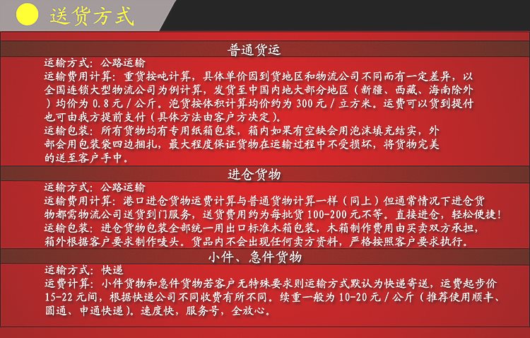 物流:客戶(hù)在買(mǎi)下大批量產(chǎn)品時(shí),請(qǐng)客戶(hù)用普通物流運(yùn)輸,這樣以節(jié)約成本,具體可以QQ或者電話(huà)詳談。