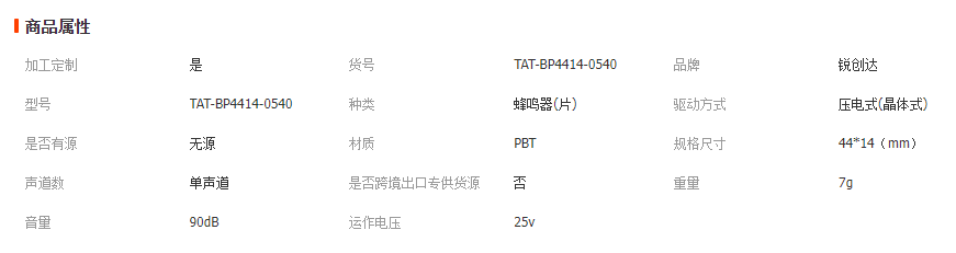 >產(chǎn)品供應(yīng)>家電行業(yè)>電器件>蜂鳴器>TAT-BP4414 現(xiàn)貨供應(yīng) 25v 1300hz >90dB 壓電式無源蜂鳴器 主營 一般經(jīng)營項(xiàng)目:電子產(chǎn)品、機(jī)械產(chǎn)品、五金配件、塑膠制品銷售
