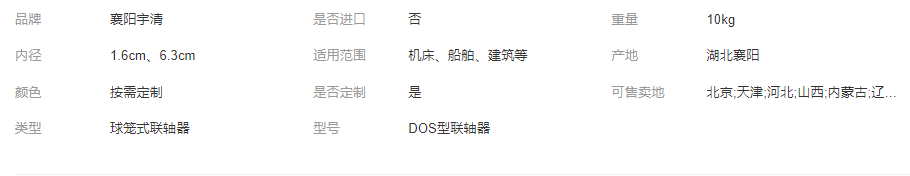 >產(chǎn)品供應(yīng)>農(nóng)業(yè)機(jī)械 >傳動(dòng)類>宇清 傳動(dòng)機(jī)械配件 DOS型 球籠式萬向聯(lián)軸器支持來圖定制 襄陽宇清傳動(dòng)科技有限公司注冊地址位于襄陽市高新區(qū)汽車工業(yè)園新星路5號,注冊機(jī)關(guān)為襄陽市市場監(jiān)督管理局,法人代表為王從強(qiáng)…