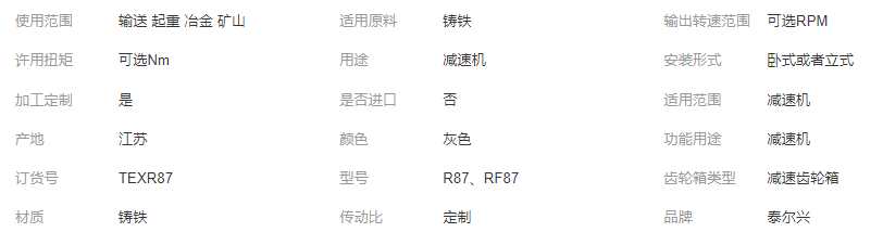 >產(chǎn)品供應(yīng)>工程配件>液壓密封裝置>液壓減速機(jī)>泰爾興硬齒面減速機(jī) R87 減速電機(jī) RF87 斜齒輪全速比可非標(biāo)定制 齒輪及齒輪減、變速箱制造;齒輪及齒輪減、變速箱銷(xiāo)售;軸承、齒輪和傳動(dòng)部件銷(xiāo)售;機(jī)械零件、零部件銷(xiāo)售;機(jī)械設(shè)備銷(xiāo)售;機(jī)…