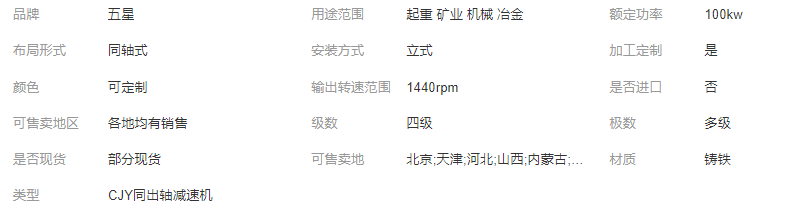 >產(chǎn)品供應(yīng)>工程配件>液壓密封裝置>液壓減速機(jī)>五星 CJY減速機(jī) 三相異步電機(jī) 同軸式 支持非標(biāo)定制 鑄鐵 輕工行業(yè)用 減速機(jī)及配件制造、銷售。(依法須經(jīng)批準(zhǔn)的項(xiàng)目,經(jīng)相關(guān)部門(mén)批準(zhǔn)后方可開(kāi)展經(jīng)營(yíng)活動(dòng))