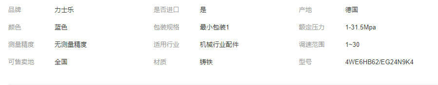 REXROTH力士樂6通徑電磁閥特征WE型號濕針交流或直流電磁鐵可選擇感應檢測位置規(guī)格6至10電氣接線可以單獨接線或集中接線可更換線圈電磁鐵REXROTH力士樂6通徑電磁閥型號:6通徑單頭電磁換向閥4WE6D(機能C,Y,EA,EB,HB)6X/EG24N9K46通徑單頭電磁換向閥4WE6D(機能C,Y,EA,EB,HB )6X/EG24N9K46通徑雙頭電磁換向閥4WE6E(機能J,M,L)6X/HG24N9K46通徑雙頭電磁換向閥4WE6E(機能J,M,L)6X/EG24N9K410通徑單頭電磁換向閥4WE10D(機能EA,EB,Y)3X/CG24N9K410通徑雙頭電磁換向閥4WE10E(機能J,L,U)3X/CG24N9K4REXROTH力士樂6通徑電磁閥