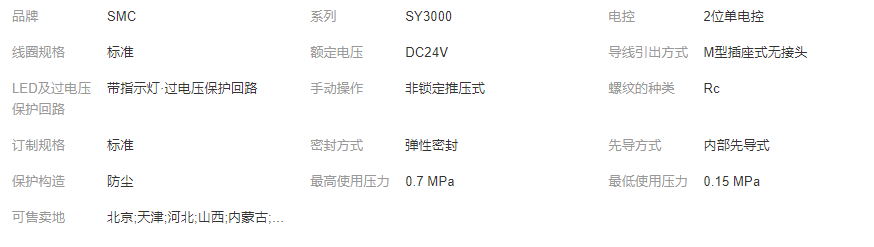字段描述 字段取值 取值描述系列 3 SY3000機(jī)能 1 2位單電控線圈規(guī)格 - 標(biāo)準(zhǔn)額定電壓 5 DC24V導(dǎo)線引出方式 MO M型插座式無(wú)接頭LED及過電壓保護(hù)回路 Z 帶指示燈·過電壓保護(hù)回路手動(dòng)操作 - 非鎖定推壓式A·B接管口徑 M5 M5X0.8螺紋的種類 - Rc托架 - 無(wú)訂制規(guī)格 - 標(biāo)準(zhǔn)CE對(duì)應(yīng) - -