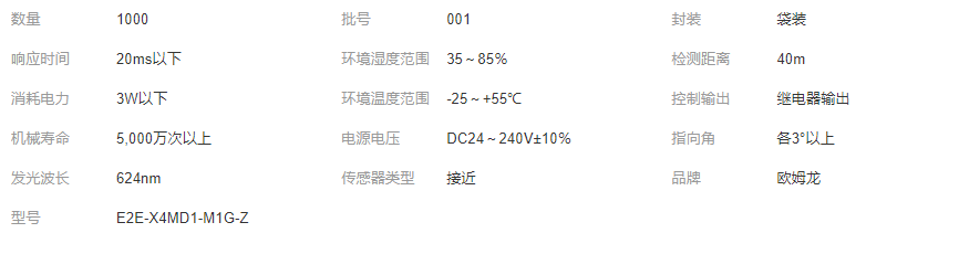 >產(chǎn)品供應(yīng)>電子行業(yè)>傳感器>歐姆龍接近傳感器E2E-X4MD1-M1G-Z X8MD1-M1G-Z E2E-X20MD1-M1G-Z 電氣設(shè)備、高低壓電器及配件、電子元器件、成套電氣設(shè)備及配件、電力金具、防爆電器銷售;貨物進(jìn)出口,技術(shù)進(jìn)出口。(依法須…