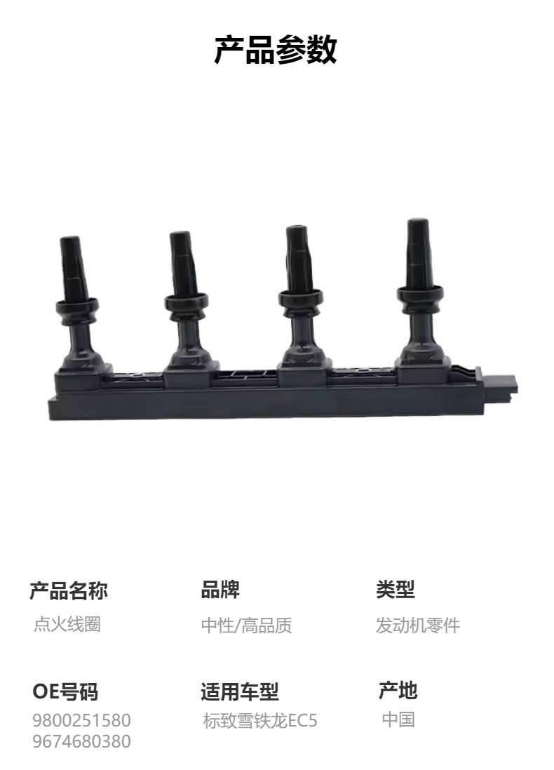 >產(chǎn)品供應> HVAC汽車>發(fā)動機系統(tǒng)>點火線圈>適用雪鐵龍標致EC5點火線圈 OE:9800251580 9674680380 優(yōu)勢供應 主營 一般項目:汽車零配件批發(fā),汽車零配件零售,汽車零部件及配件制造,